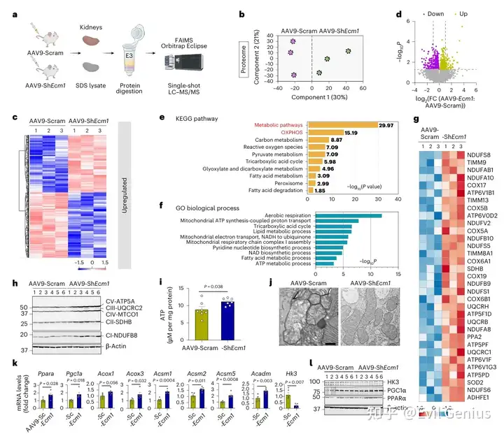 为探究Ecm1敲低缓解肾纤维化的机制,研究进行了全局蛋白质组学分析,主成分分析显示AAV9-ShEcm1组与对照组显著分离,共鉴定出654个差异表达蛋白。KEGG和GO富集分析表明,Ecm1敲低后肾脏中氧化磷酸化通路显著上调,蛋白质印迹法证实线粒体呼吸链复合物I-V亚基(ATP5A、UQCRC2、MTCO3、SDHB、NDUFA8)表达增加,同时ATP水平升高,电镜观察显示线粒体形态改善。此外,Ecm1敲低上调了线粒体生物合成关键调控因子Pgc1a的mRNA和蛋白水平,并下调糖酵解相关基因Hk3的表达,提示Ecm1抑制可通过促进线粒体氧化磷酸化、重塑能量代谢方式发挥抗纤维化作用。