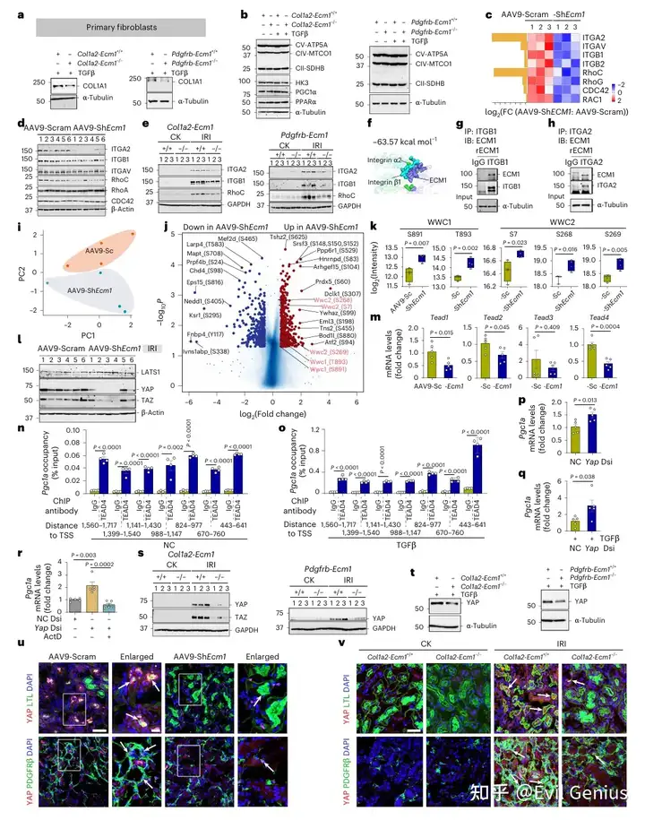 为探究ECM1调控纤维化微环境中线粒体功能的机制,研究发现成纤维细胞Ecm1敲除虽能减轻自身纤维化表型,但并不直接影响其OXPHOS水平,提示ECM1可能通过旁分泌信号影响肾小管细胞能量代谢。蛋白质组学分析显示,Ecm1敲低后整合素α2β1及RhoC表达下调;分子对接预测ECM1与整合素α2β1具有高亲和力结合位点,免疫共沉淀证实ECM1在成纤维细胞中与整合素α2结合,在肾小管细胞中则与整合素β1结合,从而介导细胞间通讯。进一步磷酸化蛋白质组学发现Ecm1敲低后Hippo通路组分WWC1/2高磷酸化,YAP/TAZ及其下游Tead表达受抑。机制上,TGFβ促进TEAD4募集至Pgc1a启动子区抑制其转录,而沉默Yap可解除此抑制并上调Pgc1a表达。在成纤维细胞特异性Ecm1敲除小鼠纤维化肾脏中,YAP/TAZ表达显著降低,且免疫荧光共染证实AAV9-ShEcm1或Col1a2-Ecm1⁻/⁻小鼠肾脏中成纤维细胞与肾小管细胞YAP水平均下降。该研究揭示了ECM1通过整合素α2β1-RhoC轴介导成纤维细胞-肾小管通讯,激活YAP-TEAD4复合物抑制Pgc1a转录,从而下调肾小管OXPHOS的力学-代谢调控通路。
