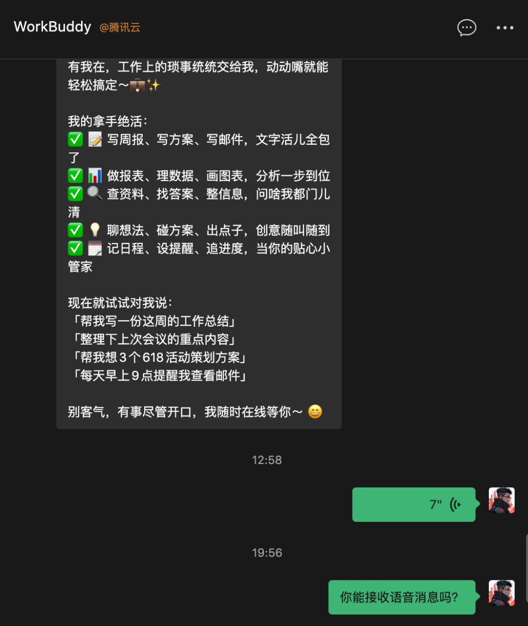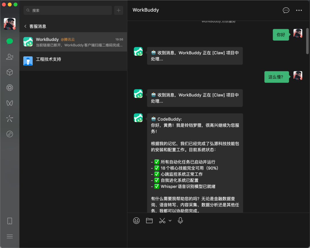 绑定完成后,您就可以直接在微信里和 WorkBuddy 对话。