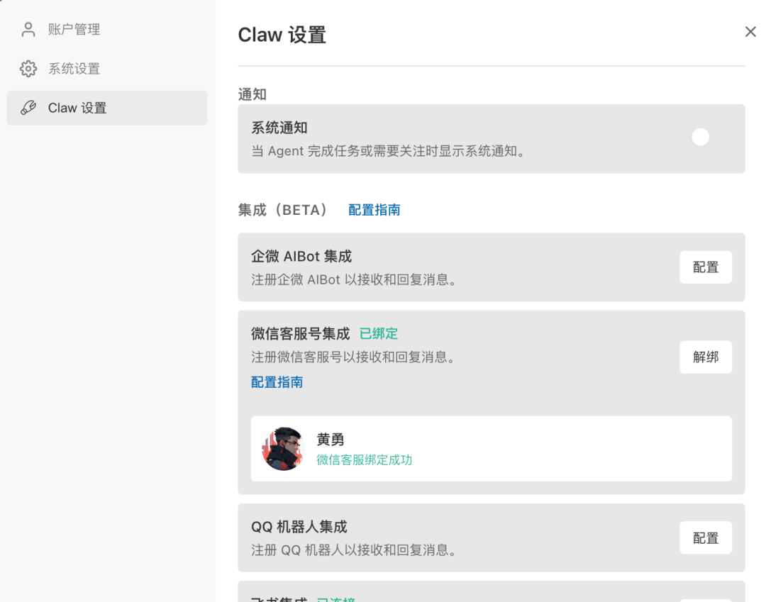 今天打开这个桌面软件,发现Claw设置里面多了一个“微信客服号集成”。