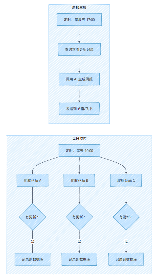 需求:每天监控 5 个竞品官网和公众号,有更新就记录,每周五生成一份汇总周报。