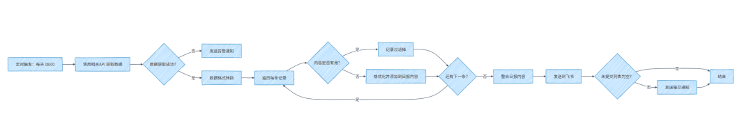 每天需要从飞书表格收集数据 → 整理成特定格式 → 发到微信群 → 同时抄送一份到邮箱。这事儿如果手动做,每天花 20 分钟;用 n8n 画个流程图,设定好每天早上 9 点自动跑,之后你就可以完全不管了。 ”