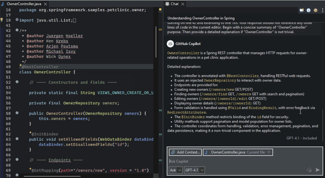 在AI辅助编码方面,MyEclipse 2026集成Copilot4Eclipse1.7插件,该插件提供代码补全与聊天能力。同时兼容GitHub Copilot插件。