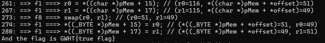 可以看到,输出了 "And the flag is GWHT{true flag}" 。说明,上面的 CheckFlagNew 函数没有执行 exit(0) 的函数。说明我们的比较是成功的。
