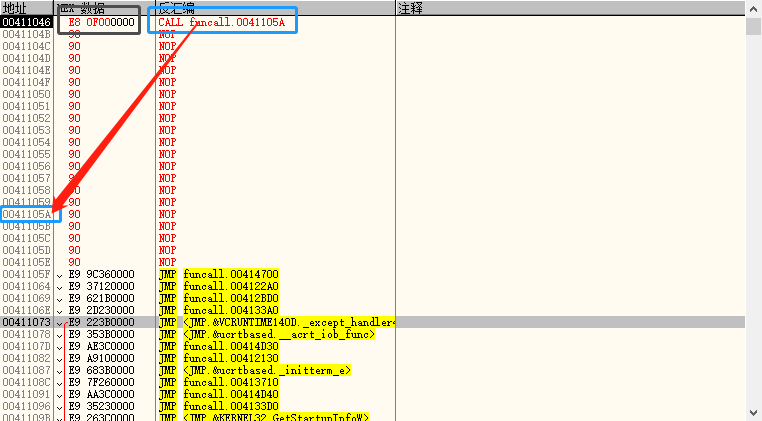 按照公式,我们的目标地址是 0041105A,当前地址是 00411046,指令长度是 5,这个指令的机器码是 5 个字节。