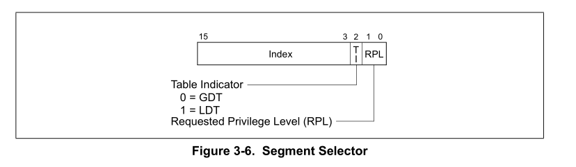 上面两个图来自 Intel 手册,上图是 段描述符 的结构,下图是段选择子的结构。从上图得知,段描述符 是 64 位的结构,段选择子是 16 位的结构;而段选择子真正用来索引的部分是从第 3 位开始的,而它的第三位不是用来进行索引的。
