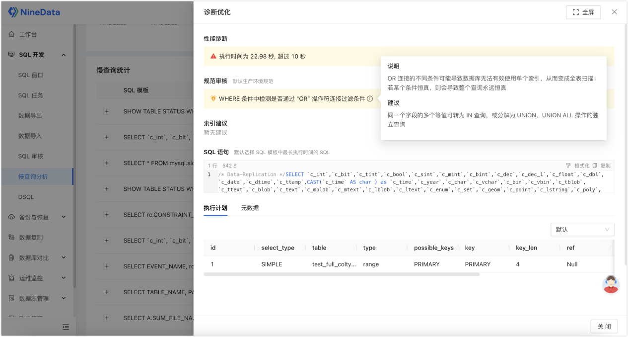 NineData 的慢查询分析不只是展示记录,还会给出 性能诊断、规范审核、索引建议 等优化信息。它不是只提醒你“这里有问题”,而是继续往下提供分析入口和优化方向。