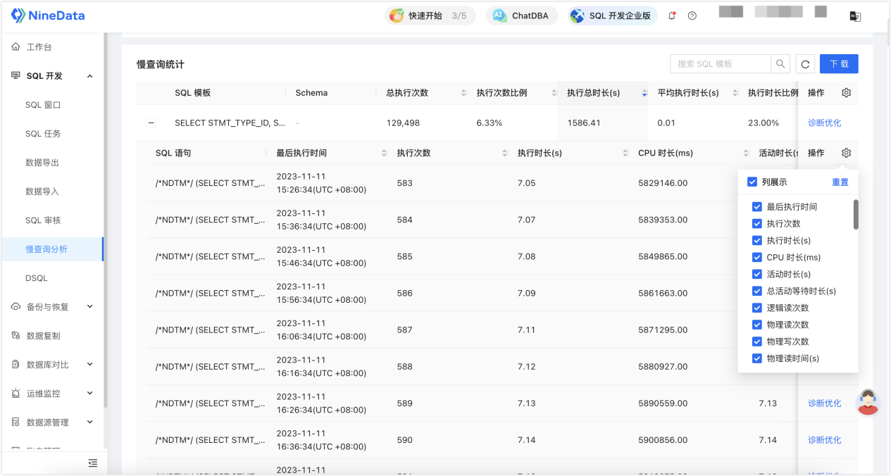 NineData 的慢查询分析能力,首先解决的是采集和留存的问题。开启慢查询采集后,系统会持续收集慢查询记录,把执行时长、返回行数、SQL 语句等信息集中展示出来。对 DBA 来说,这意味着慢查询不再散落在数据库实例里,而是有了统一入口。