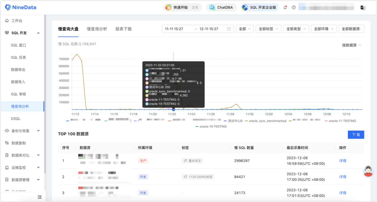 NineData 的慢查询大盘支持按 时间范围、数据源、环境、标签、数据源类型 等维度筛选和分组查看。先看全局趋势,再决定优先治理哪里。对多实例、多环境的 DBA 来说,这种“先看全局、再看细节”的方式,比人工翻日志高效得多,也更接近真实运维场景。