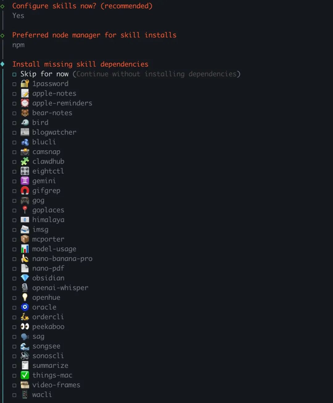 然后 Skills 配置,不熟悉可以跳过,选择「Skip for now」。