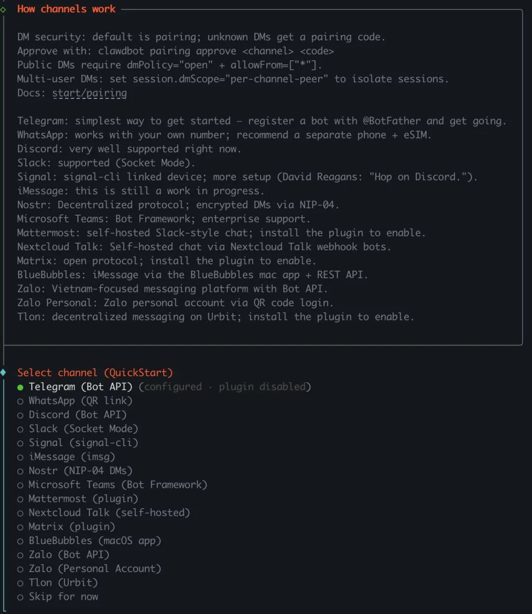 它支持 Telegram, WhatsApp, Discord, Slack, iMessage。