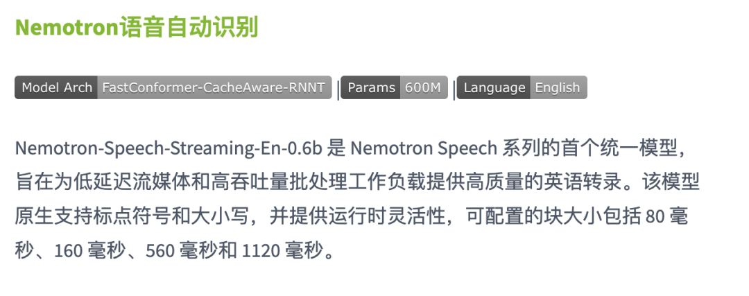 官方推出了 Nemotron Speech ASR 0.6B 参数模型。