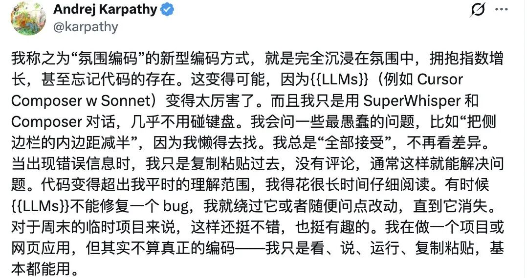 前特斯拉 AI 总监 Andrej Karpathy 曾提到过一种编程状态:你不再纠结于具体的语法分号,而是像个指挥家一样,凭着直觉(Vibe)和 AI 协作,快速构建产品。