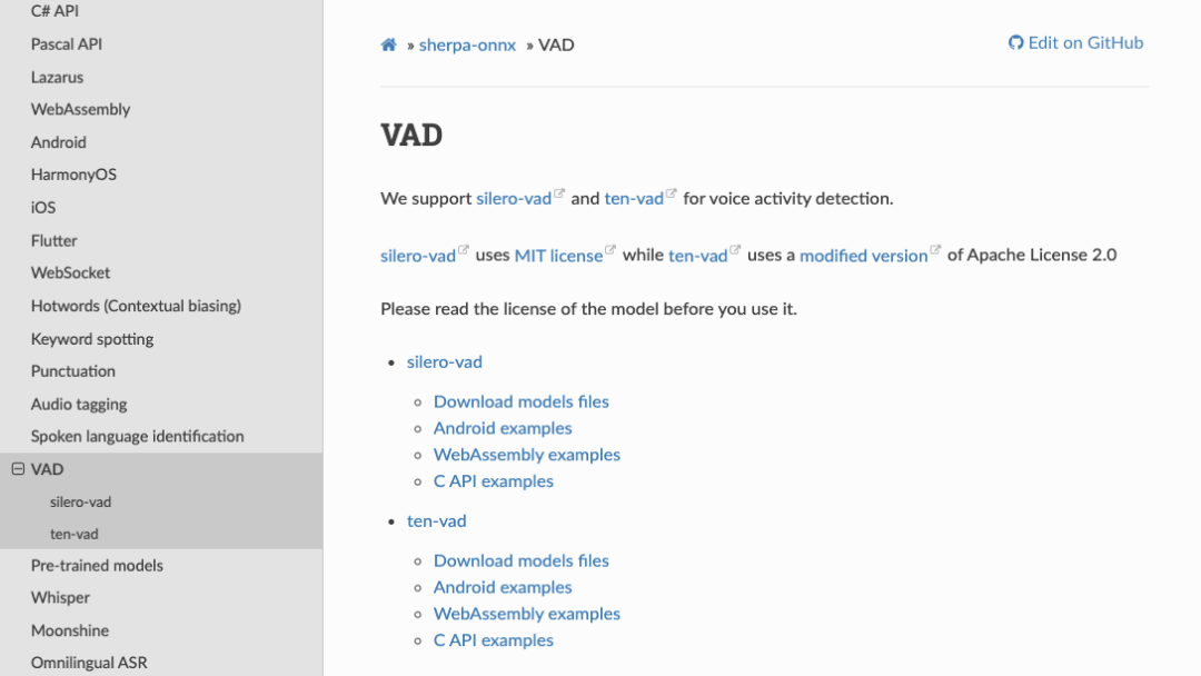TEN-VAD GitHub:https://github.com/TEN-framework/ten-vad Kaldi2支持TEN VAD文档:https://k2-fsa.github.io/sherpa/onnx/vad/index.html TEN VAD的转录案例:https://medium.com/@ten-framework/boost-real-time-transcription-performance-higher-accuracy-lower-latency-with-ten-vad-d6e83c8aa5ec