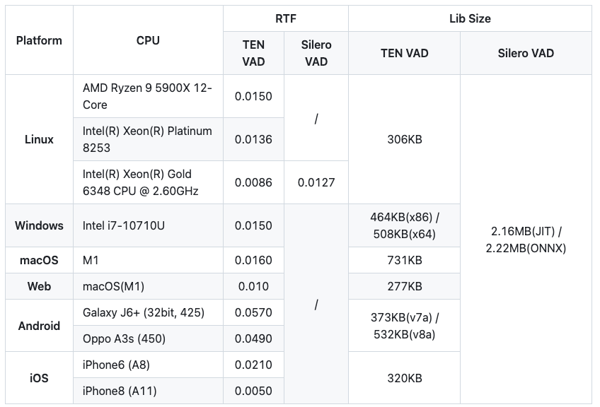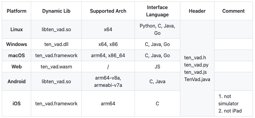 TEN VAD 提供跨平台 C 兼容性,支持五个操作系统(Linux x64、Windows、macOS、Android、iOS),Python 绑定针对 Linux x64 进行了优化,Web 端支持 wasm。