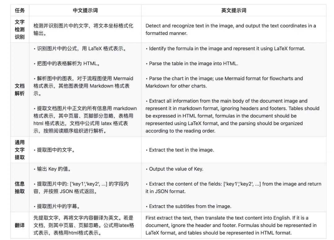 官方也给了一套推荐的OCR任务提示词,可参考此类方式应用于各场景: