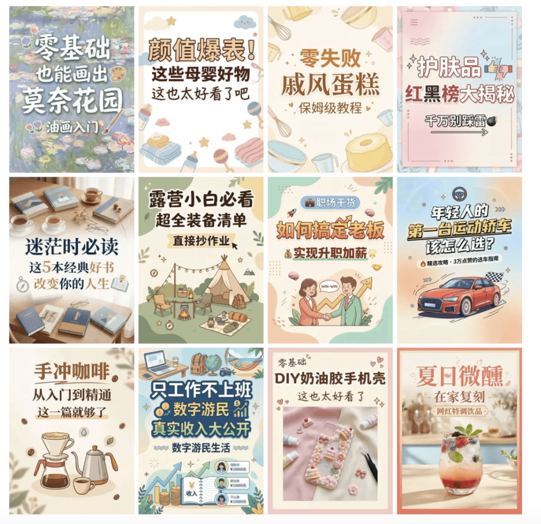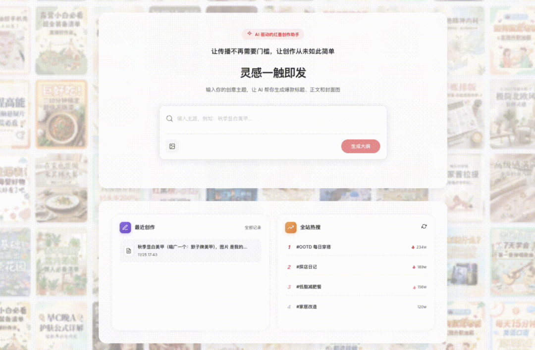 只需「一句话 + 一张图」,就能自动生成符合小红书风格的完整图文内容,包括封面、内页文字和配图!