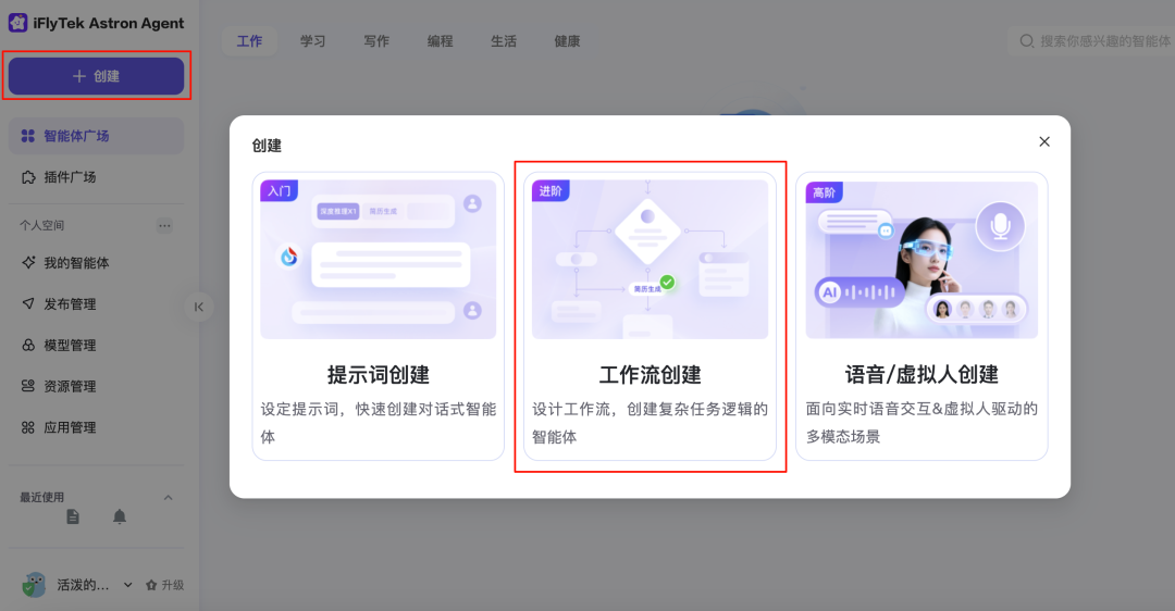 首先点击左侧菜单栏的『创建』按钮,在弹出的悬浮窗口中我们选择进阶的『工作流创建』。