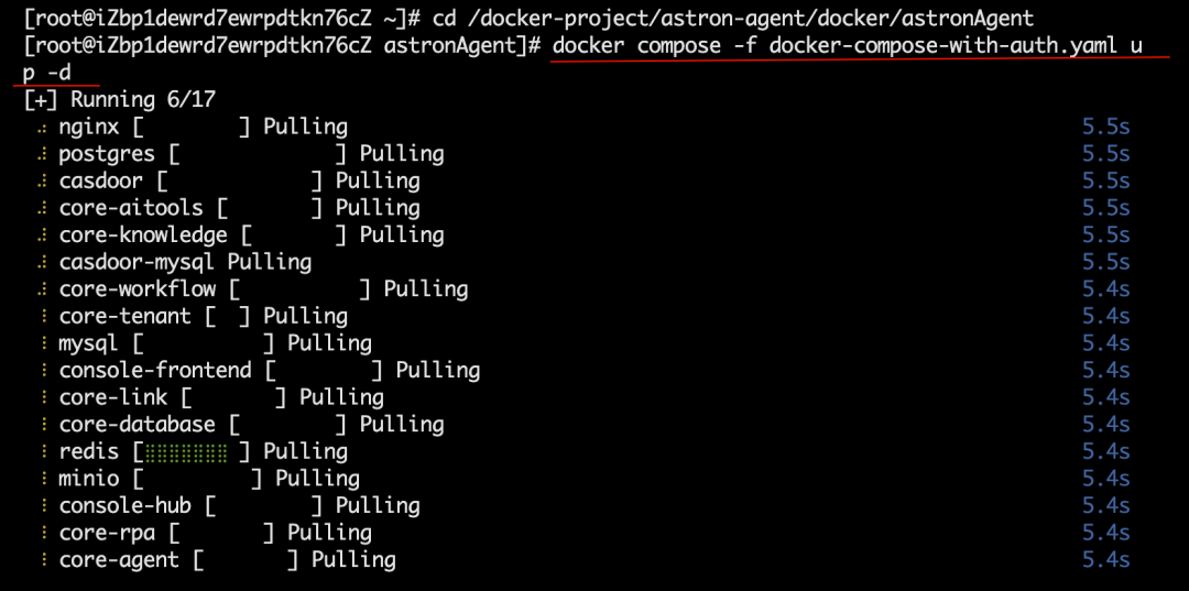 整个拉取镜像的过程可能需要些时间,过程中也可能拉取失败,多执行几次继续拉取,Docker 会自动跳过已经拉取成功的镜像。