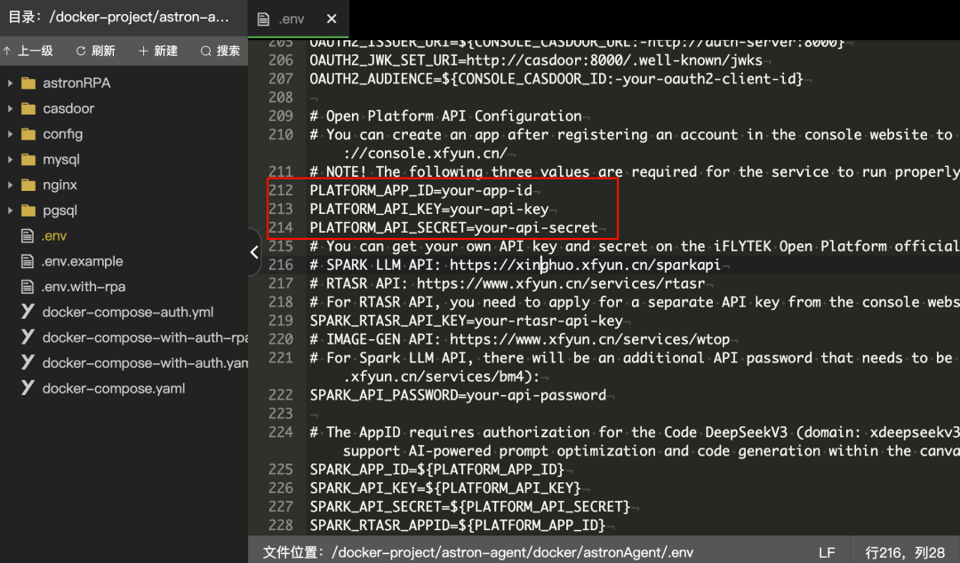 vim .env然后就可以在 .env 文件中找到 PLATFORM_APP_ID 等配置项,将其修改为你自己的配置信息即可。