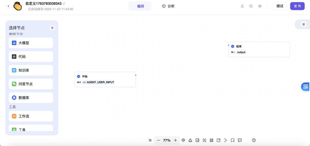 我这里选择『自定义创建』,然后会跳转到『工作流编排』界面,你可以通过左侧的工具、大模型、知识库、插件等各种节点,拖动到右侧画布中进行编辑、连线,从而完成你想要实现的 AI 应用的业务逻辑。