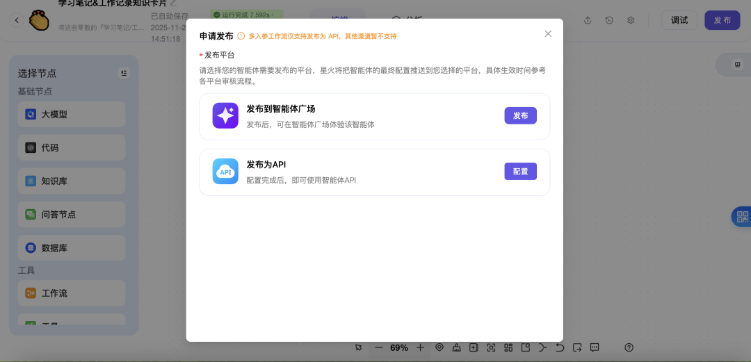 工作流一切调试完毕后,还可以将其发布到智能体广场或发布为智能体API。(像我这个就不适合发布为API,就直接发布为智能体)