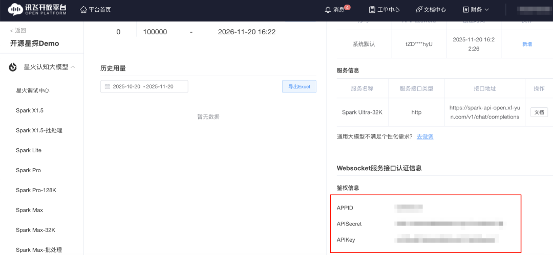 相关的配置信息用户可以自行去讯飞开放平台申请即可,如果之前申请过即可直接更新到环境变量中即可。