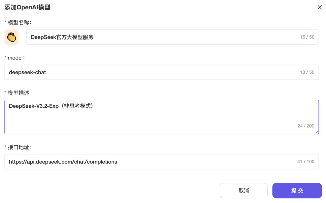 这里我先以DeepSeek V3大模型为例【大家如果想接入讯飞星辰自家的大模型API,可以到讯飞星辰 MaaS 平台上申请免费额度(或讯飞星辰开放平台获取)】,然后填写以下必填信息即可: