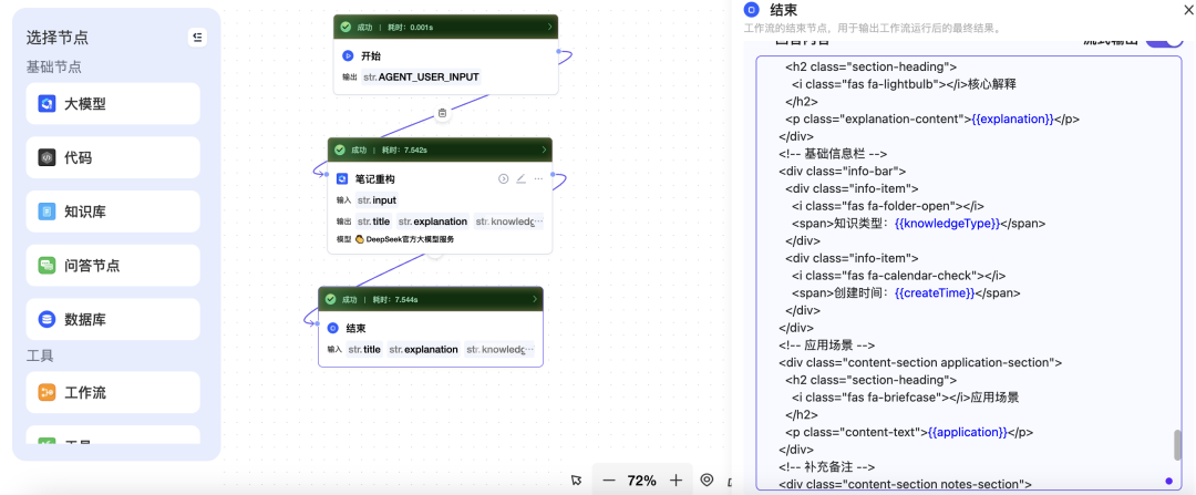 而后在结束节点根据事先设计调试好的知识卡片模板进行相关输出变量填充。