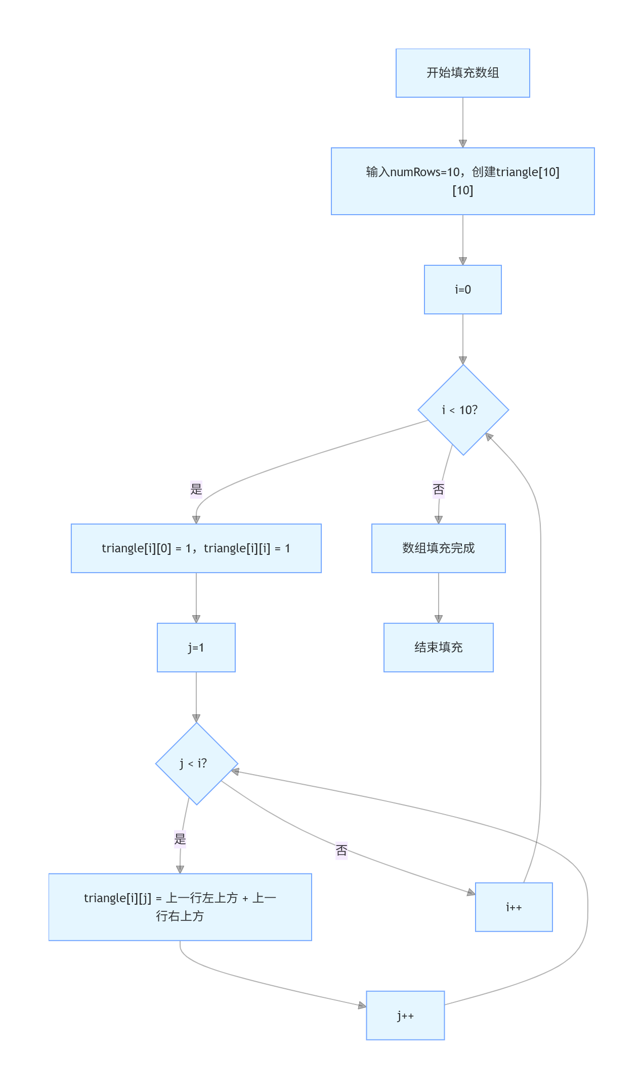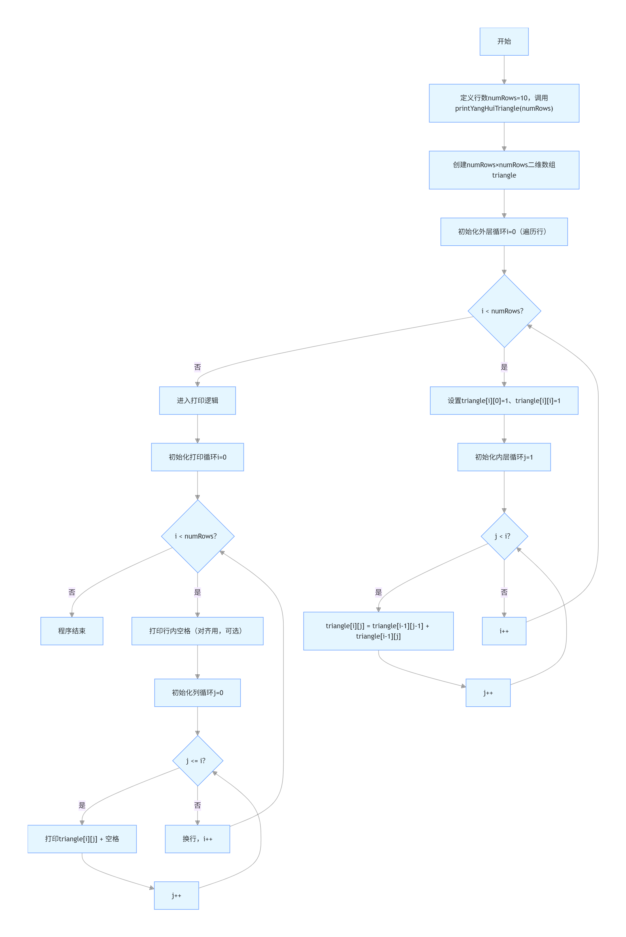 }numRows x numRows 的二维数组 triangle 来存储杨辉三角形的值。i 遍历每一行。j 遍历每一行的每一个元素。for (int i = 0; i < numRows; i++) {