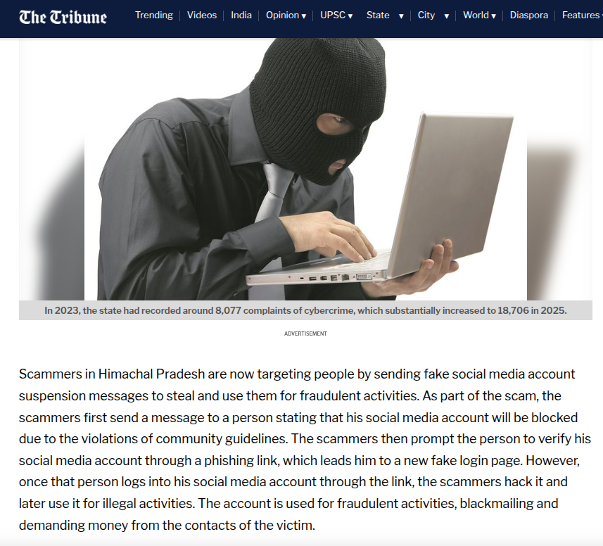 近期,印度喜马偕尔邦警方披露的一系列针对社交媒体用户的网络钓鱼案件,揭示了攻击者如何利用“账号封禁”这一高频痛点构建精密的欺诈陷阱。据《Tribune India》报道,该地区的网络犯罪投诉量从2023年的8,077起飙升至2025年的18,706起,增幅高达133%。这一数据的剧烈波动并非偶然,而是反映了攻击团伙正在系统化地利用用户对账号安全的焦虑心理。攻击者通过发送伪造的违规通知,诱导受害者点击恶意链接,在高度仿真的伪登录界面中窃取凭据,随后利用被盗账号对受害者的社交联系人实施勒索或诈骗。