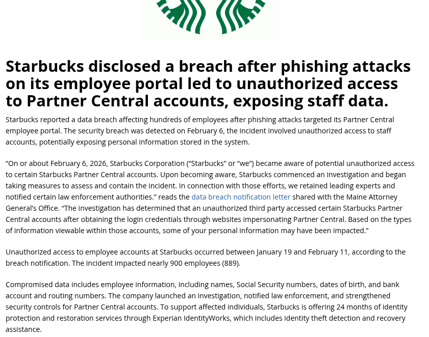 根据Security Affairs等媒体的报道,星巴克此次数据泄露的起点极有可能是针对特定员工群体的定向钓鱼攻击(Spear Phishing)。攻击者首先通过公开渠道(如LinkedIn、企业官网)收集了目标员工的姓名、职位及部门信息,构建了详细的受害者画像。随后,攻击者伪造了看似来自公司内部人力资源部门或IT支持团队的紧急通知邮件,内容通常涉及“薪资单更新”、“福利变更”或“密码过期警告”。