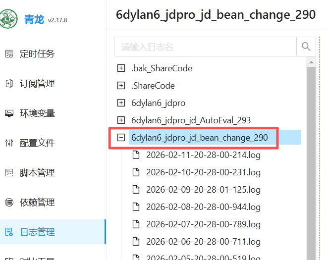 这个文件名是从青龙面板——日志管理里找对应脚本的日志目录,如“京豆变动/资产情况”的脚本目录是下图,最后的数字290好像每个青龙会不一样,好像。