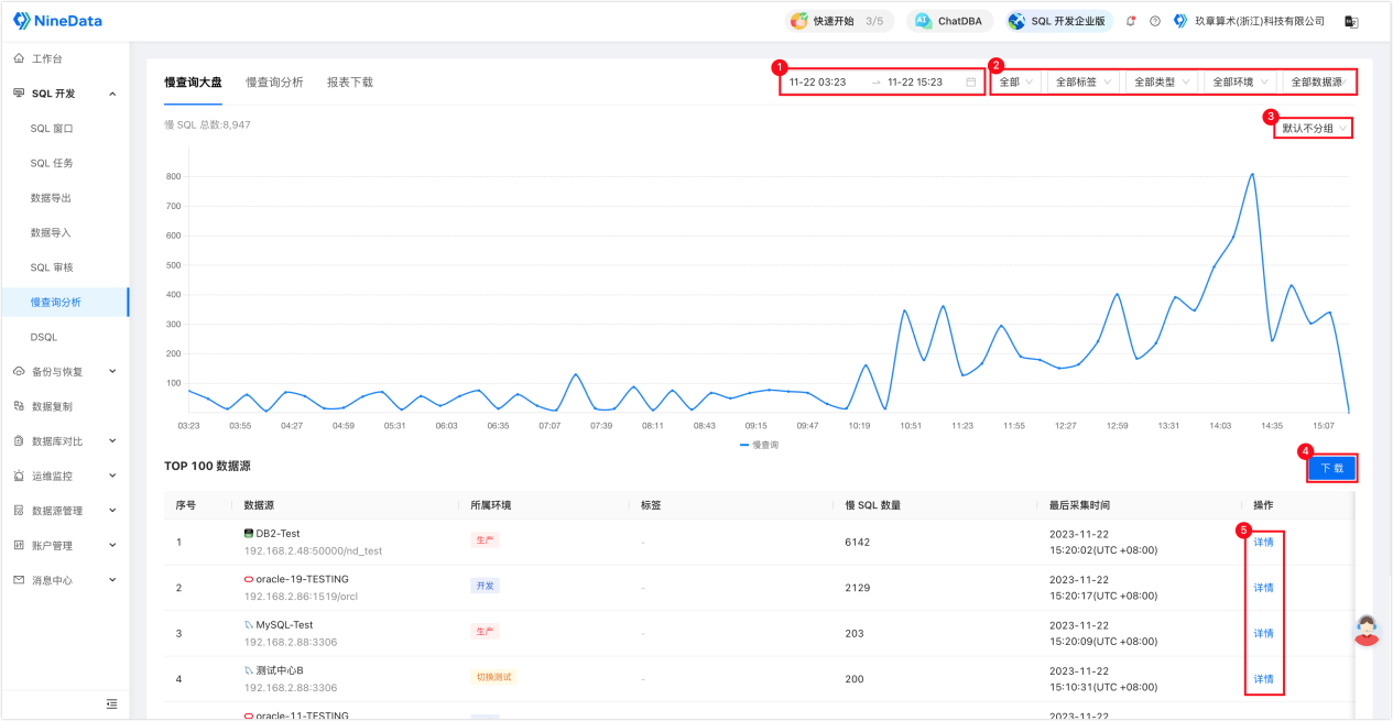 (查询分析支持按时间范围、环境、数据源等维度查看趋势,并继续下钻到具体慢 SQL)
