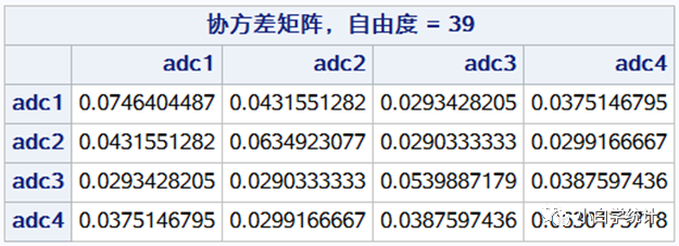 从左上到右下的对角线上的4个值,是4个变量的方差;其它值是行列对应的变量的协方差(反映了2个变量的相关大小)。关于协方差和相关系数的关系,可参见以前文章。