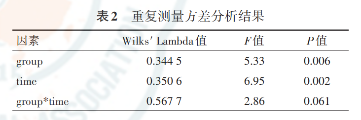 分组比较是指,以某一时间点 的两组差值为参照,所有其他时间点的两组差值与参照时 间点两组差值的比较结果。表 3 给出了以第 1个时间点为 参照,其他时间点与参照点的总体比较和分组比较结果。