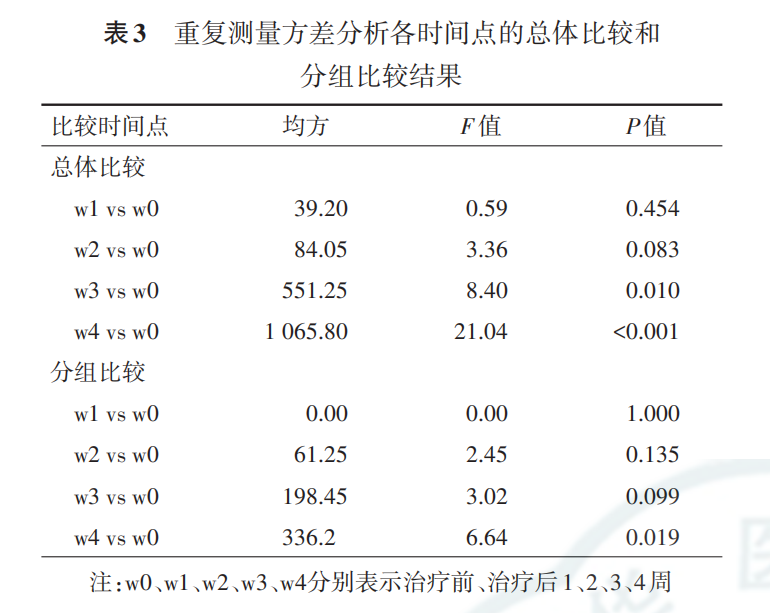 表 3结果提示,从所有观测值来看(不分组),治疗后第 3、4 周与治疗前相比差异均有统计学意义(P 值均<0.05)。从分组结果来看,治疗后第 4 周两组差值与治疗前两组差 值的差异具有统计学意义(P=0.019),结合表1可以看出,治 疗前两组差值为4.2,治疗后第4周两组差值为12.4,两者差 异有统计学意义。