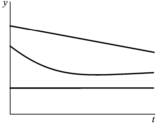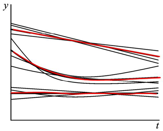 如果认为研究对象的变化趋势可能不止一个,如图2和图3所示,认为这些人可能有三种变化趋势,这时候可以用增长混合模型(Growth Mixture Model)或潜类别增长模型(Latent Class Growth Model)。这两种方法都可以探索同一人群的多个变化轨迹,但是假定不同,潜类别增长模型(也叫做轨迹模型,trajectory model)相对简单,假定每一个轨迹内部没有变异(如图2所示,只有3个轨迹,轨迹内所有人的趋势都一样);而混合增长模型稍微复杂,允许每一个轨迹内部也存在变异(就像图3一样,尽管有3个主要轨迹,但是每一个轨迹内的线条仍有不同)。