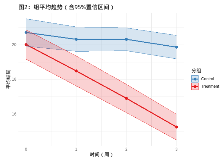Treatment组个体是否都呈下降趋势?Control是否稳定?如果是,则说明“组别×时间”存在交互效应,提示应在模型中包含group*time项Treatment和Control轨迹频繁交叉?表明表明个体响应差异大,但仍可能有总体趋势差异(GEE适合处理这种情况)然后是各组的平均趋势图,且带95%的置信区间。这张图展示的是每组在每个时间点的平均结局及其置信区间。它把个体复杂性“压缩”成群体趋势,突出整体模式。