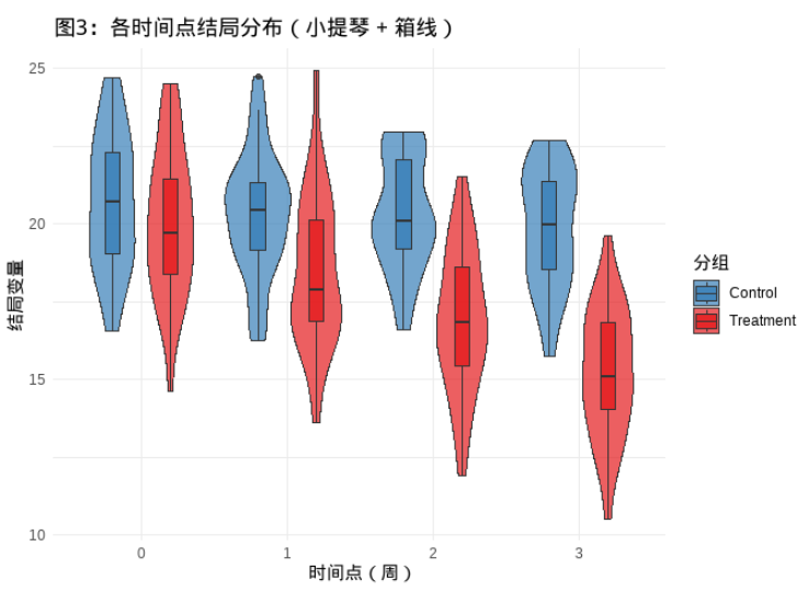 Treatment和Control的CI是否重叠,若不重叠,说明随机化可能失败,可能需要调整基线)Treatment组是否随时间下降更快?如果是,则提示需要在模型中加入group:time交互项time设为分类变量,或加入二次项这张图可以展示每个时间点、每组的分布特征:中位数、四分位距、偏态、离群值、分布形状。可以用于判断: