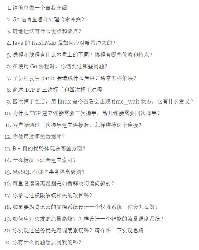 今天分享的是腾讯校招的一面面经 ,大厂拷问的知识点都很广泛,如果你也准备冲击大厂,一定要做足了准备,语言基础、数据库、缓存、消息队列、操作系统、计算机网络、算法、项目 等等,基本上都会问到而且会问的很全很细,而且去大厂面试,要是没通过的话还会有记录,后面还想再去面就难咯。