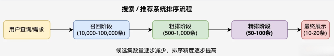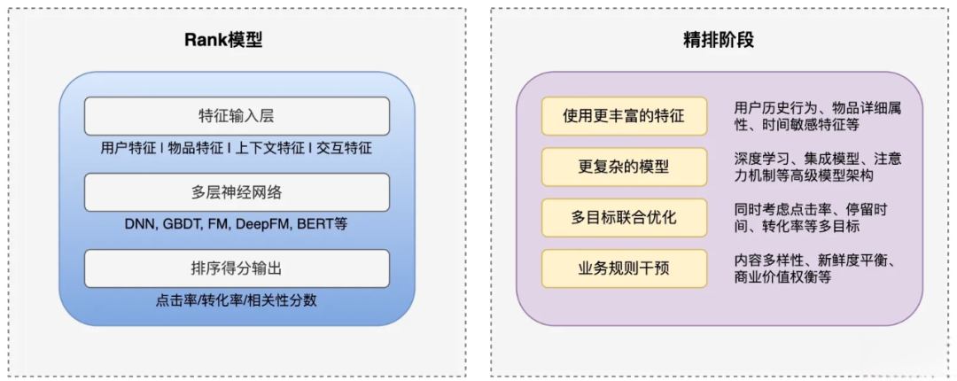 精排(精确排序)是搜索 / 推荐系统的最后阶段,使用计算复杂度更高的算法,考虑更多特征和业务规则,对少量候选项进行更复杂、精细的排序。