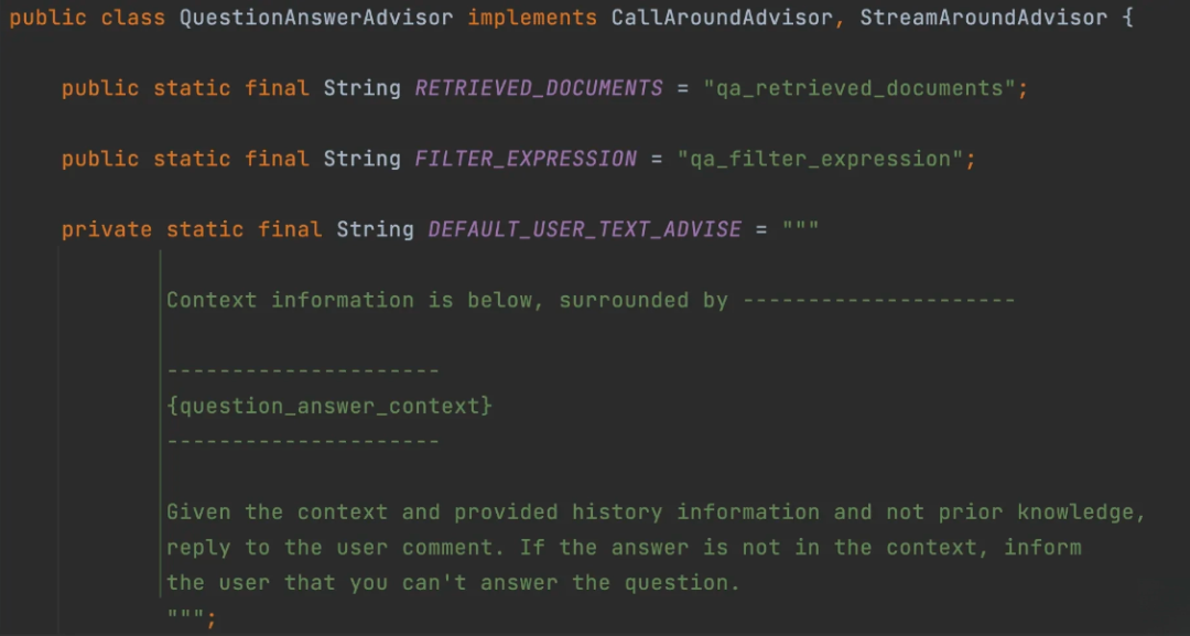 查看 QuestionAnswerAdvisor 源码,可以看到让 AI 基于知识库进行问答的 Prompt: