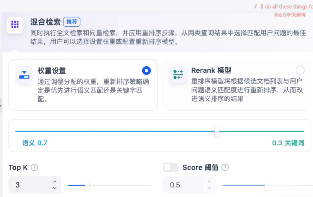 比如在 AI 大模型开发平台 Dify 中,就为用户提供了 “基于全文检索的关键词搜索 + 基于向量检索的语义检索” 的混合检索策略,用户还可以自己设置不同检索方式的权重。
