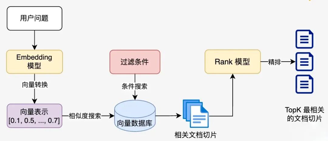 相似度搜索:在向量数据库中查找与问题向量最相似的文档块,常用的相似度搜索算法有余弦相似度、欧氏距离等