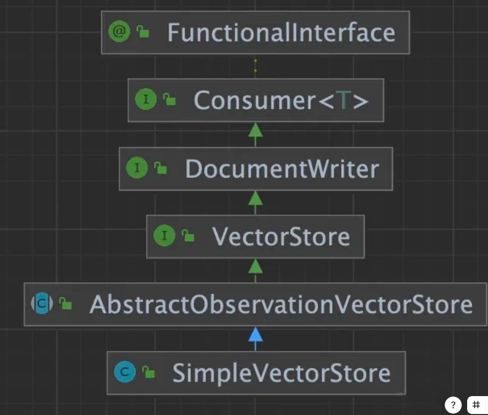 SimpleVectorStore 实现了 VectorStore 接口,而 VectorStore 接口集成了 DocumentWriter,所以具备文档写入能力。如图: