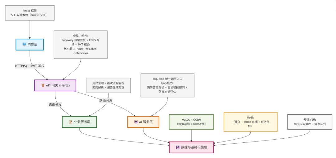 不像那些只会机械问答的工具,我们的SaaS是真有“面试官范儿”——从简历智能扒重点、精准抛问题,到专业评估答案、生成复盘报告,面试全链路直接包圆。之前做企业知识库项目时,就因为AI交互太生硬被甲方打回,这次用Hertz+Eino硬撑技术底座,每个功能都经受过真实业务的“毒打”(具体代码可戳 README.md,直接扒走)。