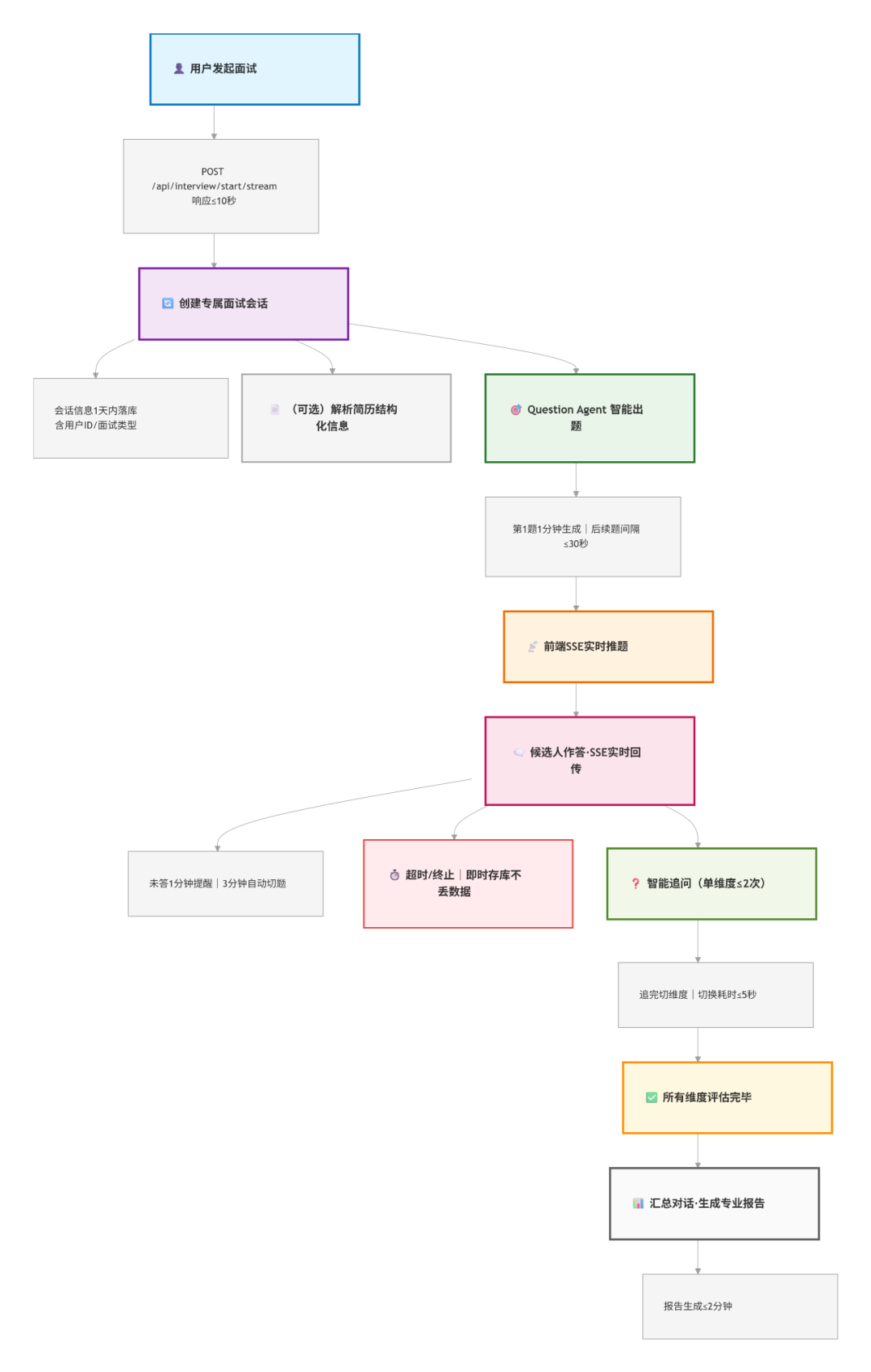 backend/main.go,直接拿去改改就能用,省大心了。pkg/eino包,拆成“简历分析、智能提问、答案评估、报告生成”四大块。这招是从企业知识库项目学的,之前把所有AI逻辑堆一起,改个提问规则就得动整个模块,现在想用哪个插哪个,扩展性直接拉满。架构细节在 doc/后端架构设计.md,这种思路做其他AI服务也香到爆。backend/internal/repository/database.go,适合需要快速迭代的项目,谁用谁知道。AI面试官为啥像真人?全靠背后一套严谨的“工作流程”管着。我们把复杂逻辑拆成清晰步骤,一眼看透:
