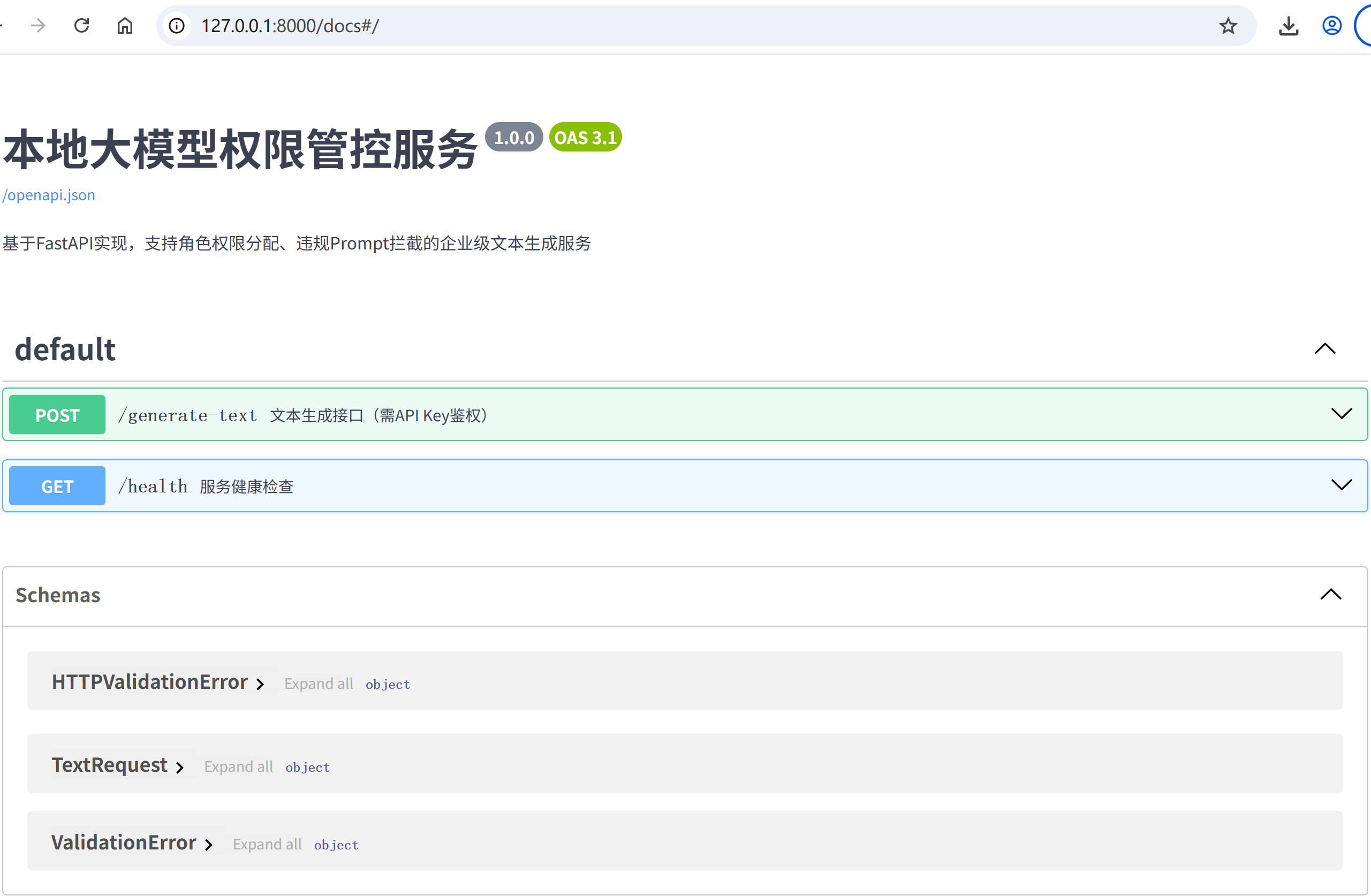 description="基于FastAPI实现,支持角色权限分配、违规Prompt拦截的企业级文本生成服务",