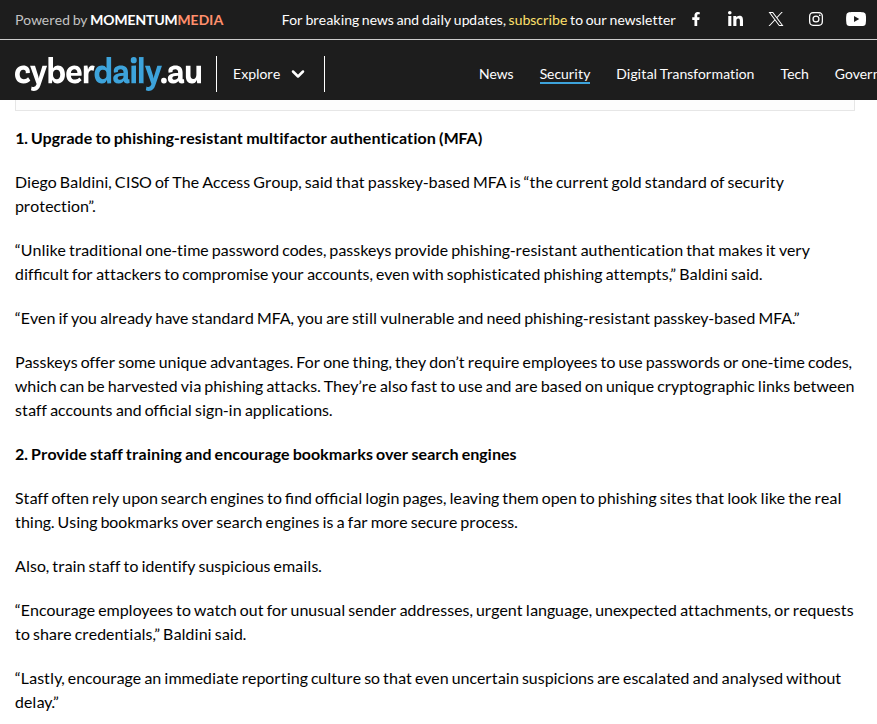 在传统的安全防御体系中,用户名加密码的组合早已千疮百孔,而基于短信验证码或TOTP(基于时间的一次性密码)的多因素认证(MFA)虽在一定程度上提升了安全性,但在面对高级钓鱼攻击时仍显力不从心。攻击者可以搭建实时代理服务器(如Evilginx),在用户输入密码和OTP的瞬间将其截获并转发给真实服务器,从而完成“中间人”攻击。针对这一痛点,业界迫切需求一种能够从根本上抵御钓鱼的认证机制。Access Group首席信息安全官Diego Baldini提出的“基于Passkey的MFA是当前安全保护的黄金标准”,正是对这一趋势的准确判断。